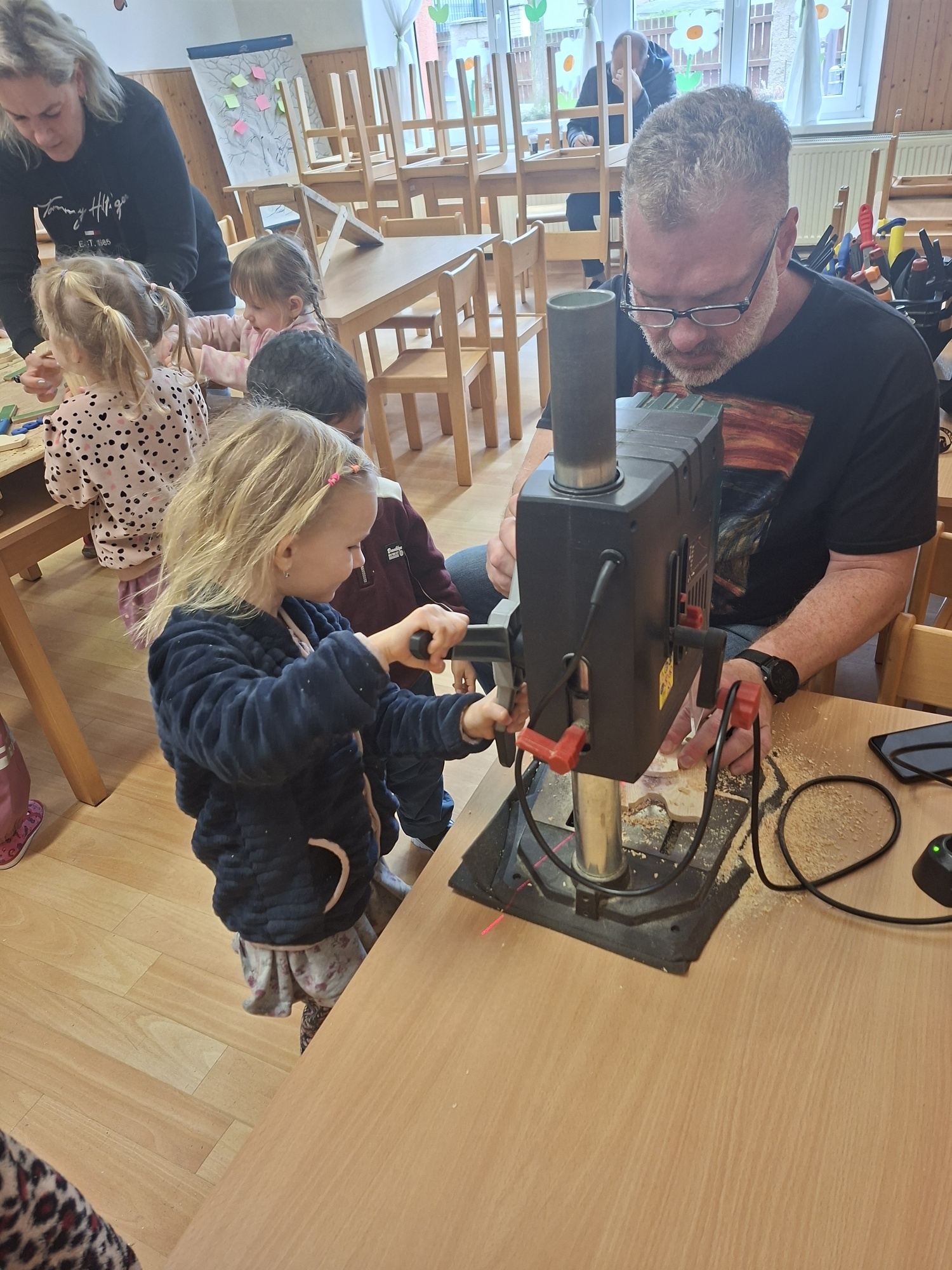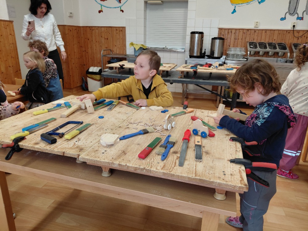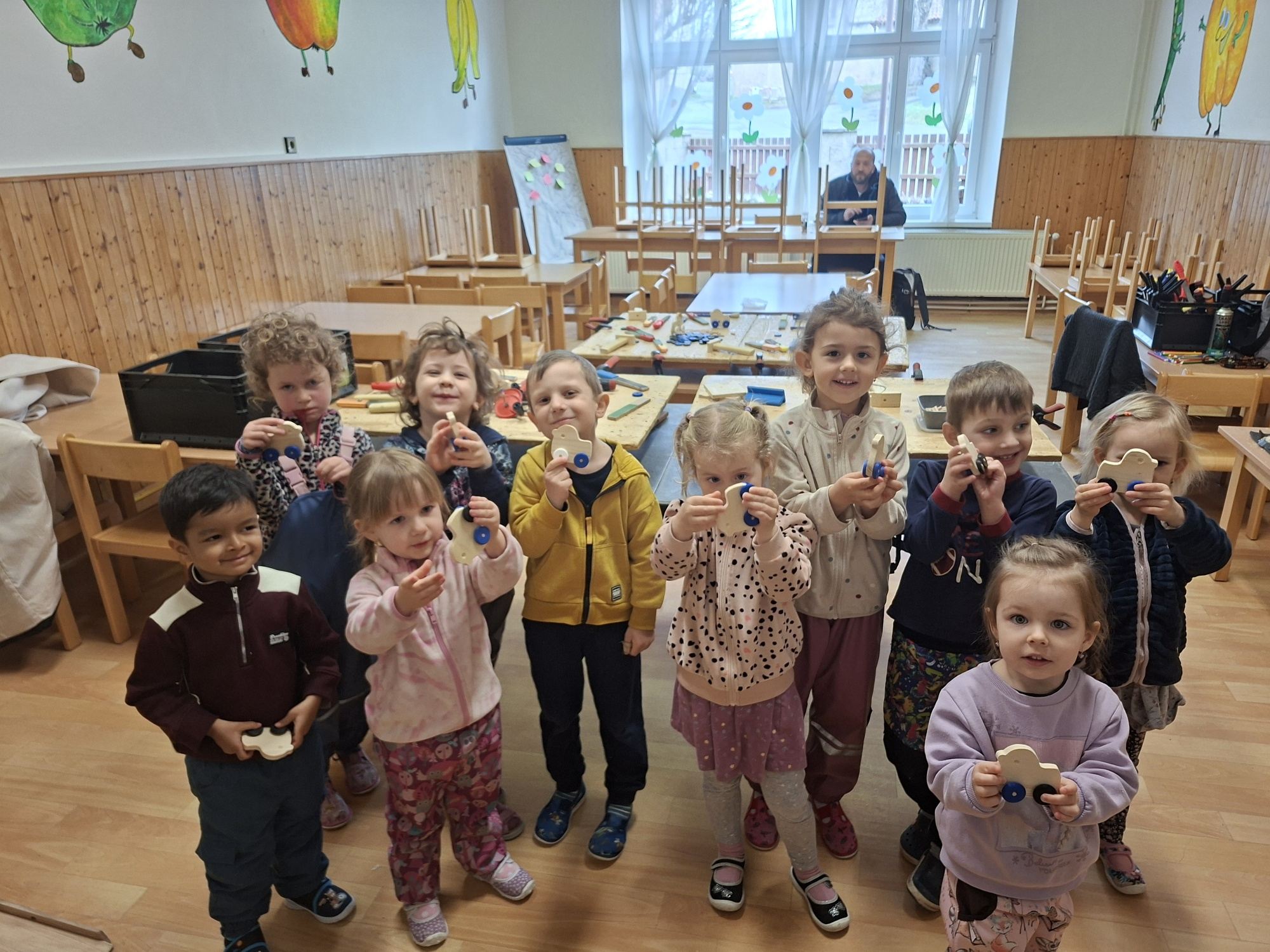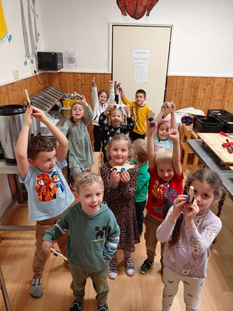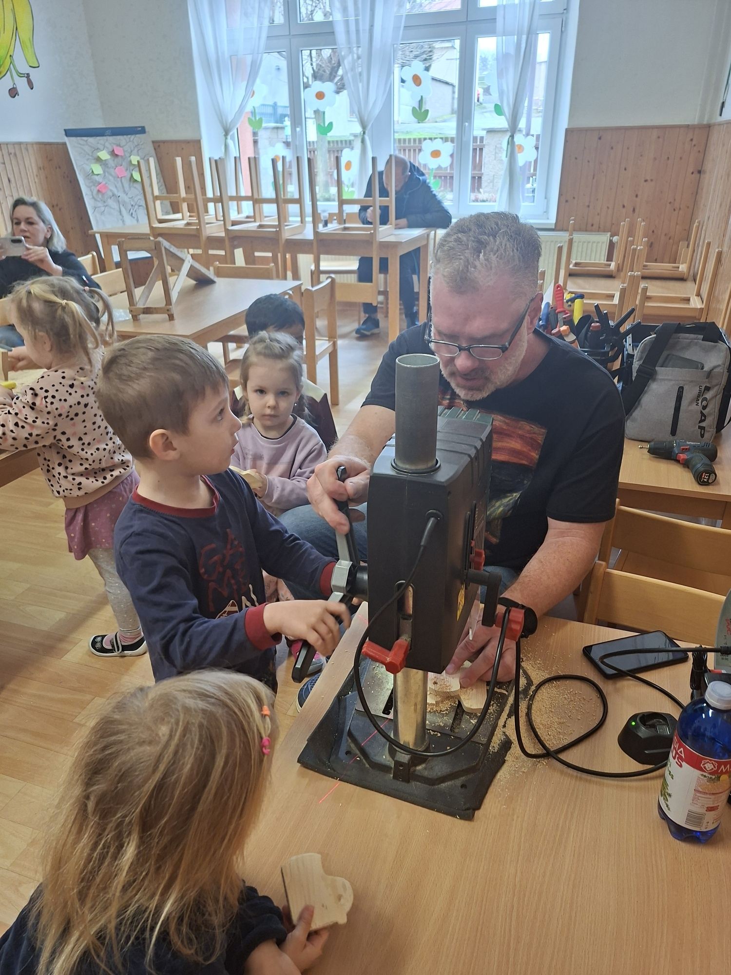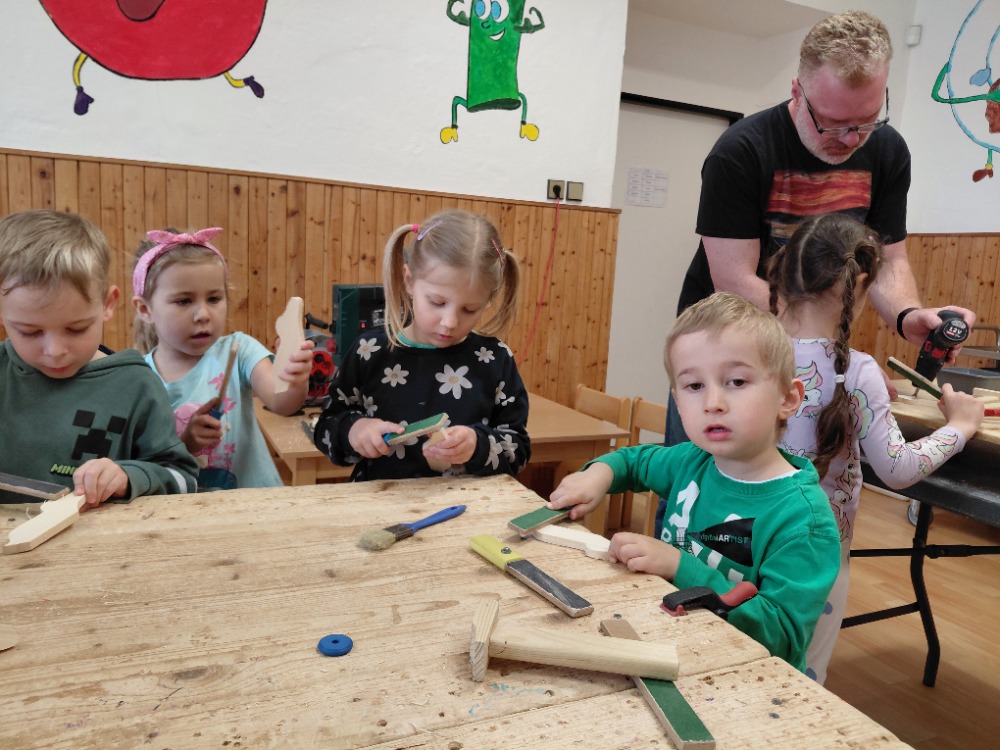 Dnes jsme měli na programu dílnu, kde jsme si mohli vyzkoušet práci se dřevem. Pod vedením zkušeného lektora se na stolech začaly objevovat dřevěné kačenky a pejsci. Hotové výrobky udělaly maminkám a tatínkům velikou radost.