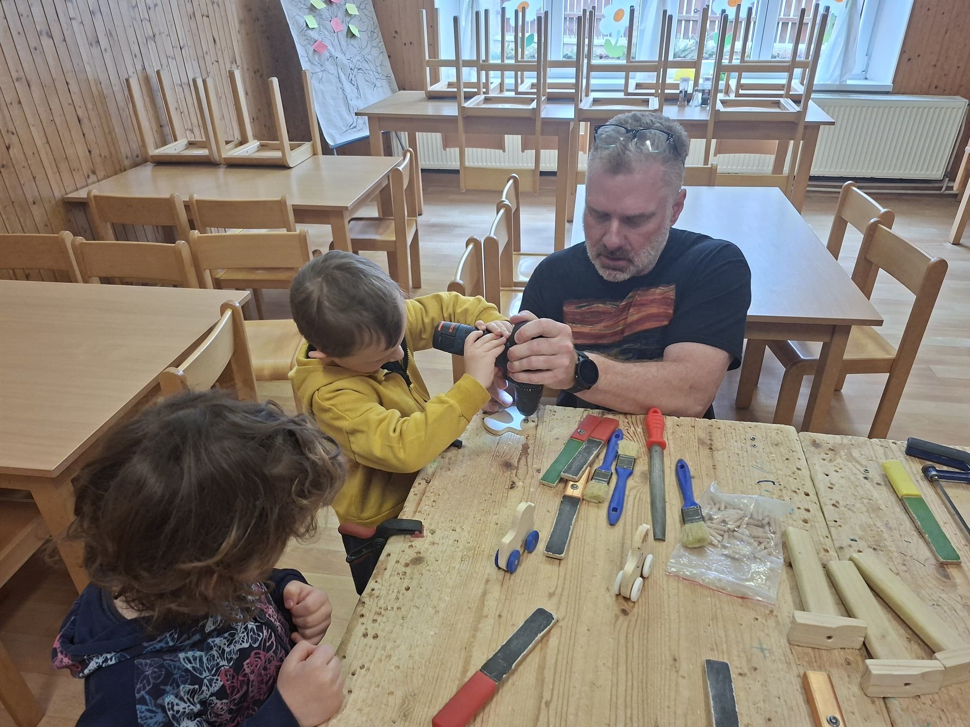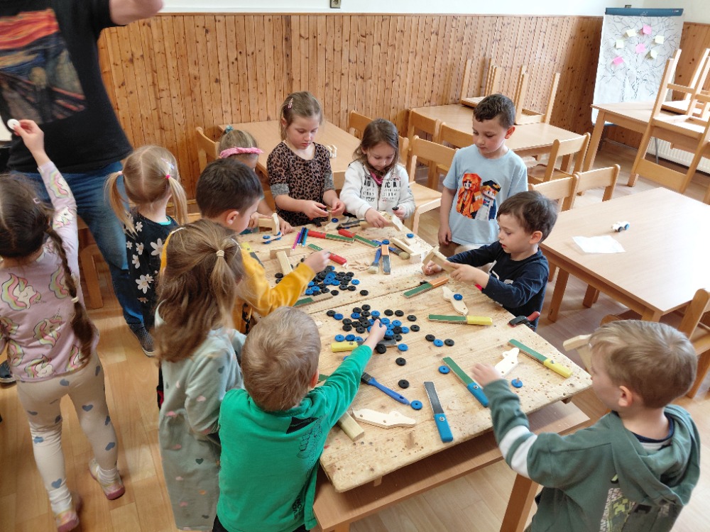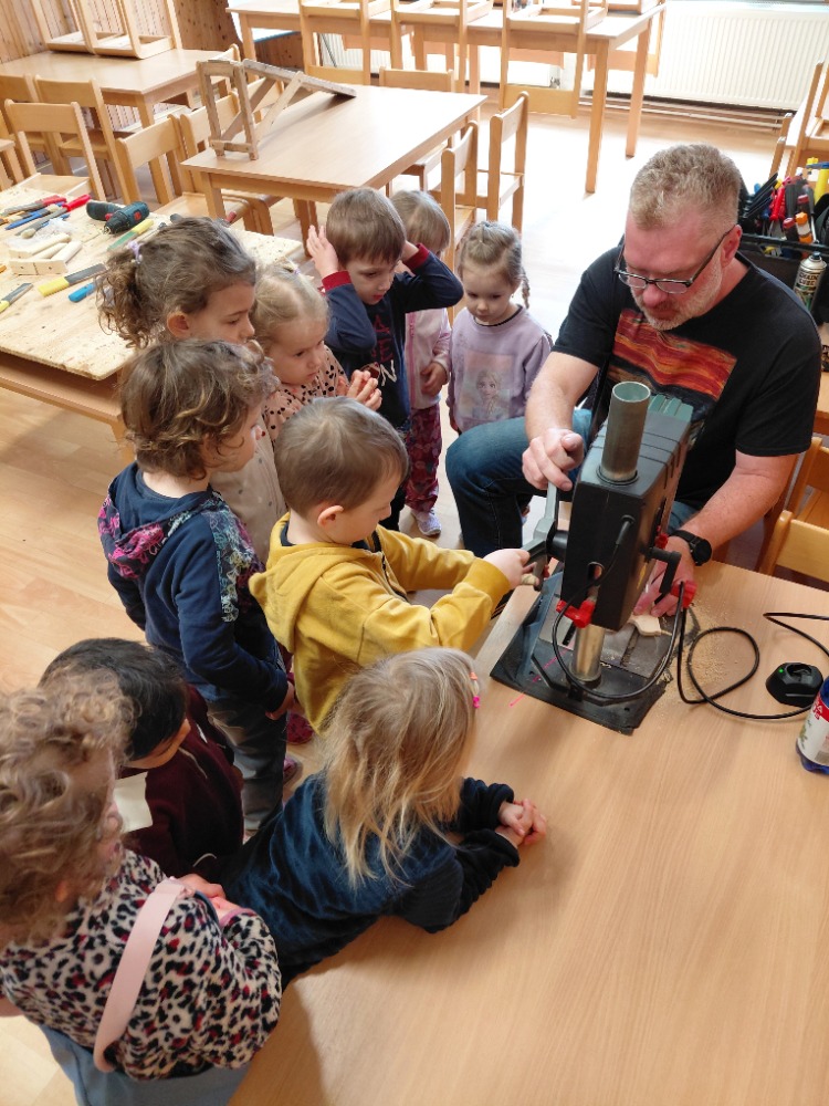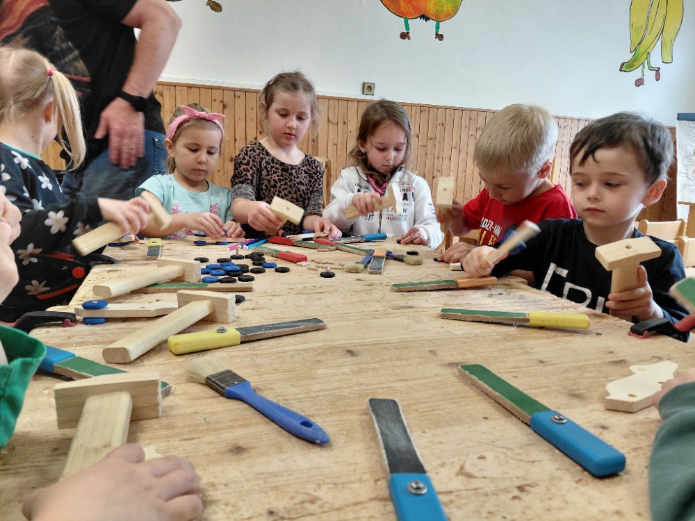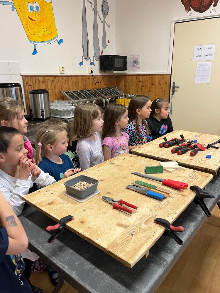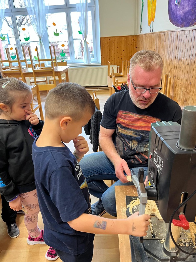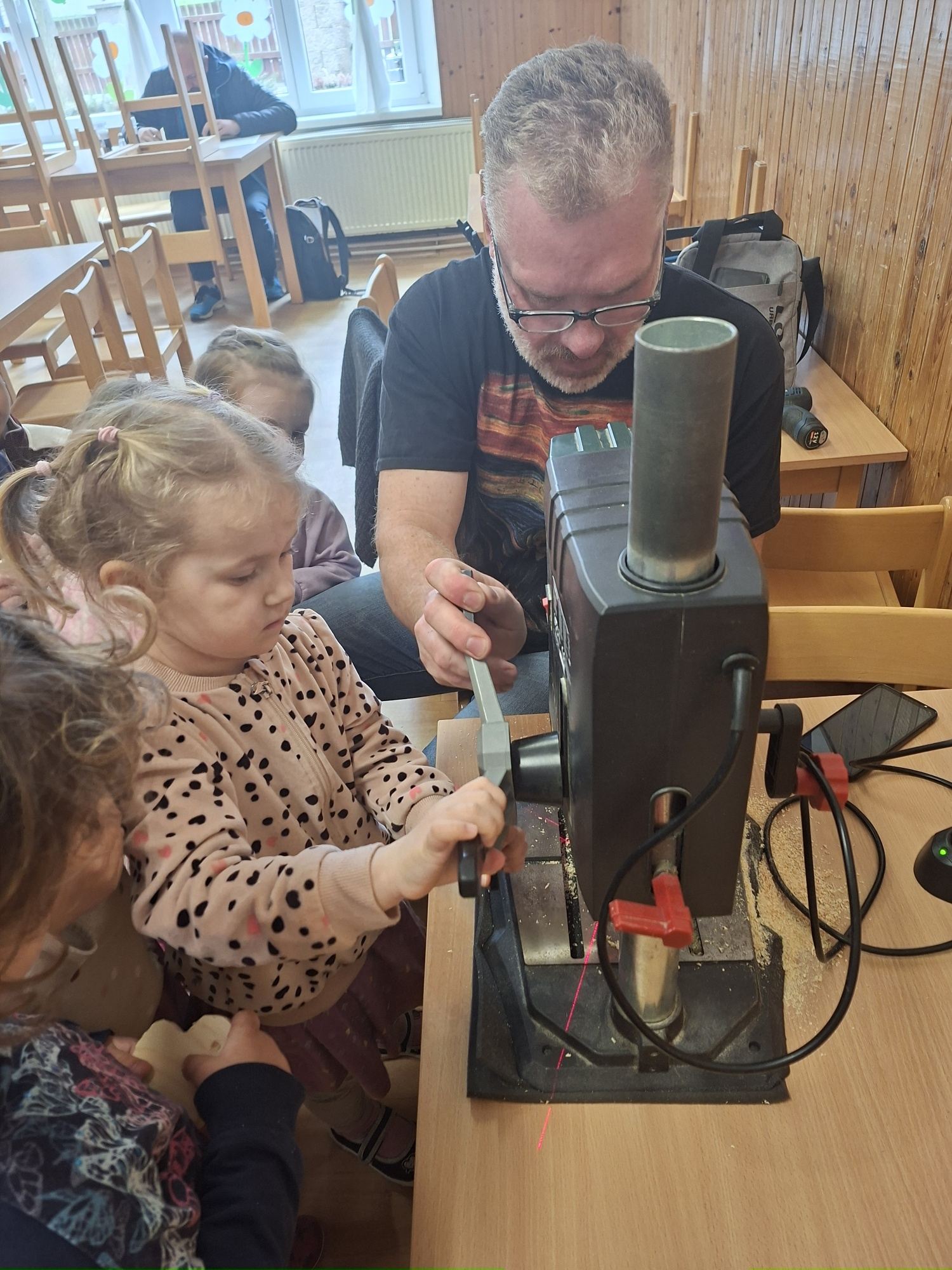 Dnes jsme měli na programu dílnu, kde jsme si mohli vyzkoušet práci se dřevem. Pod vedením zkušeného lektora se na stolech začaly objevovat dřevěné kačenky a pejsci. Hotové výrobky udělaly maminkám a tatínkům velikou radost.