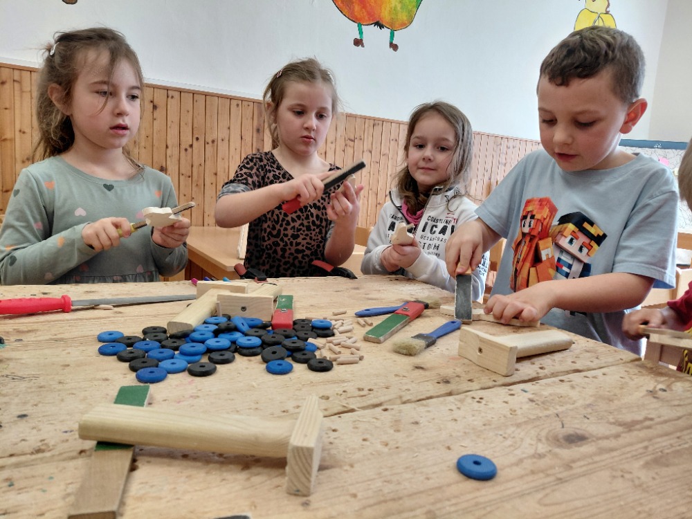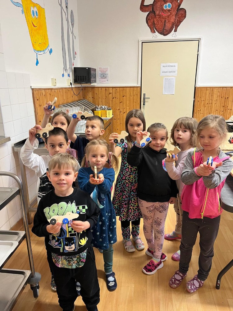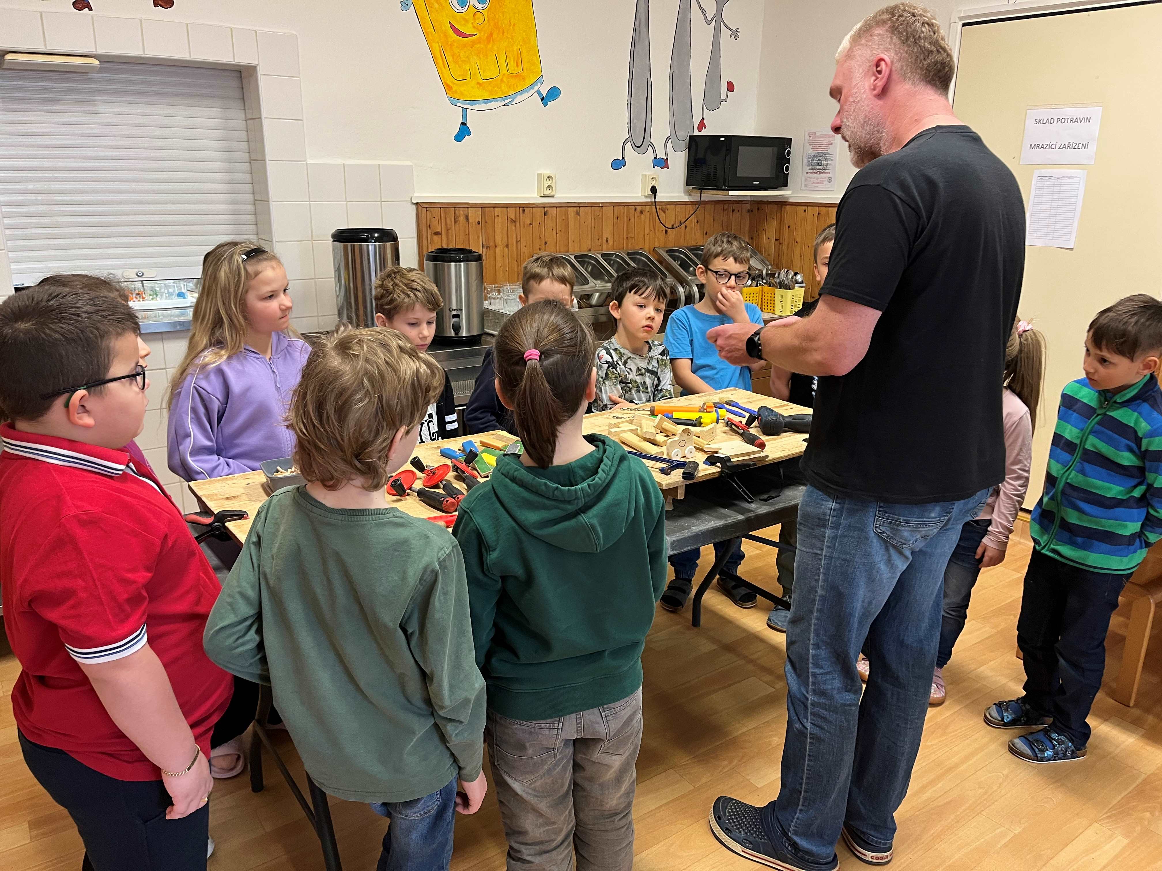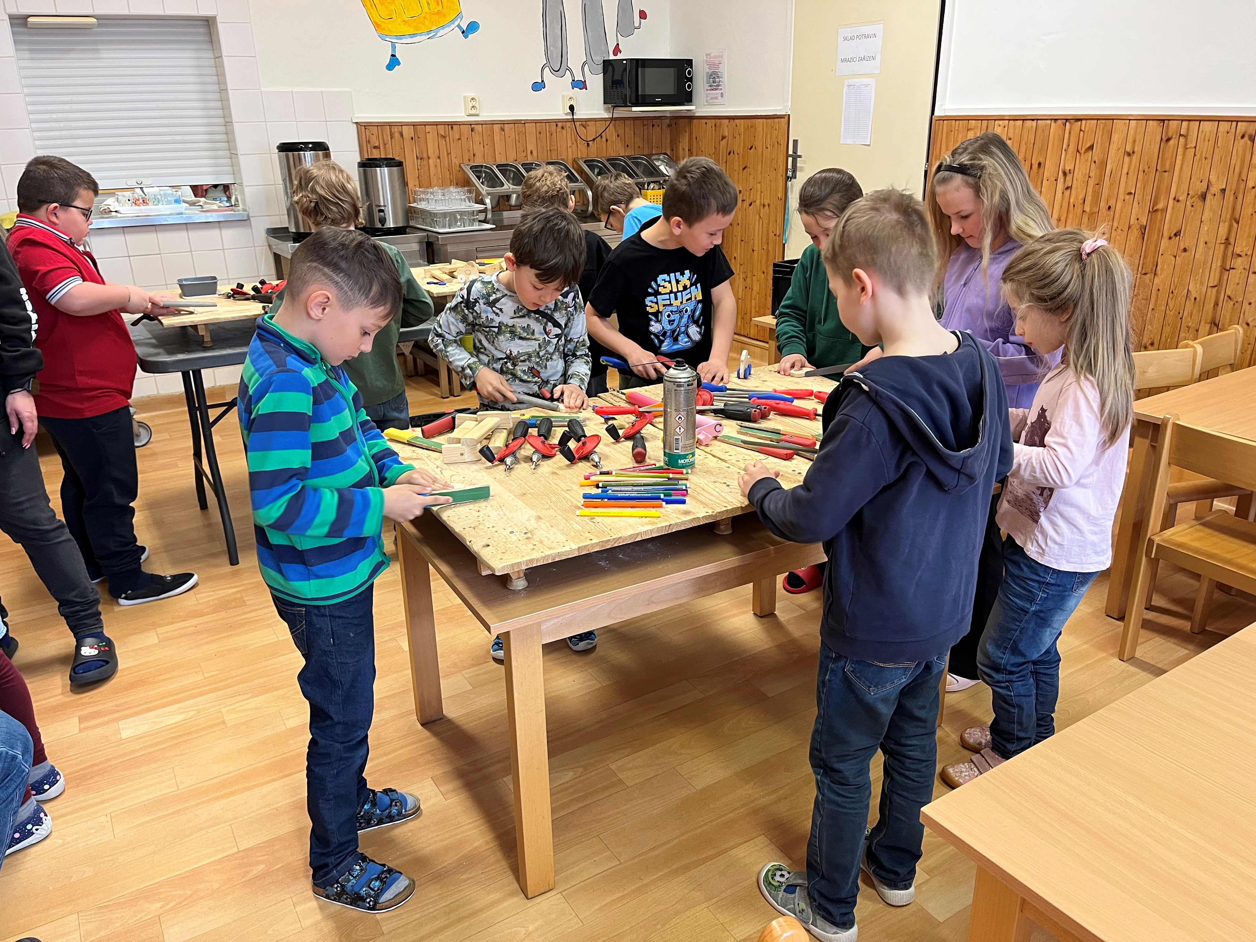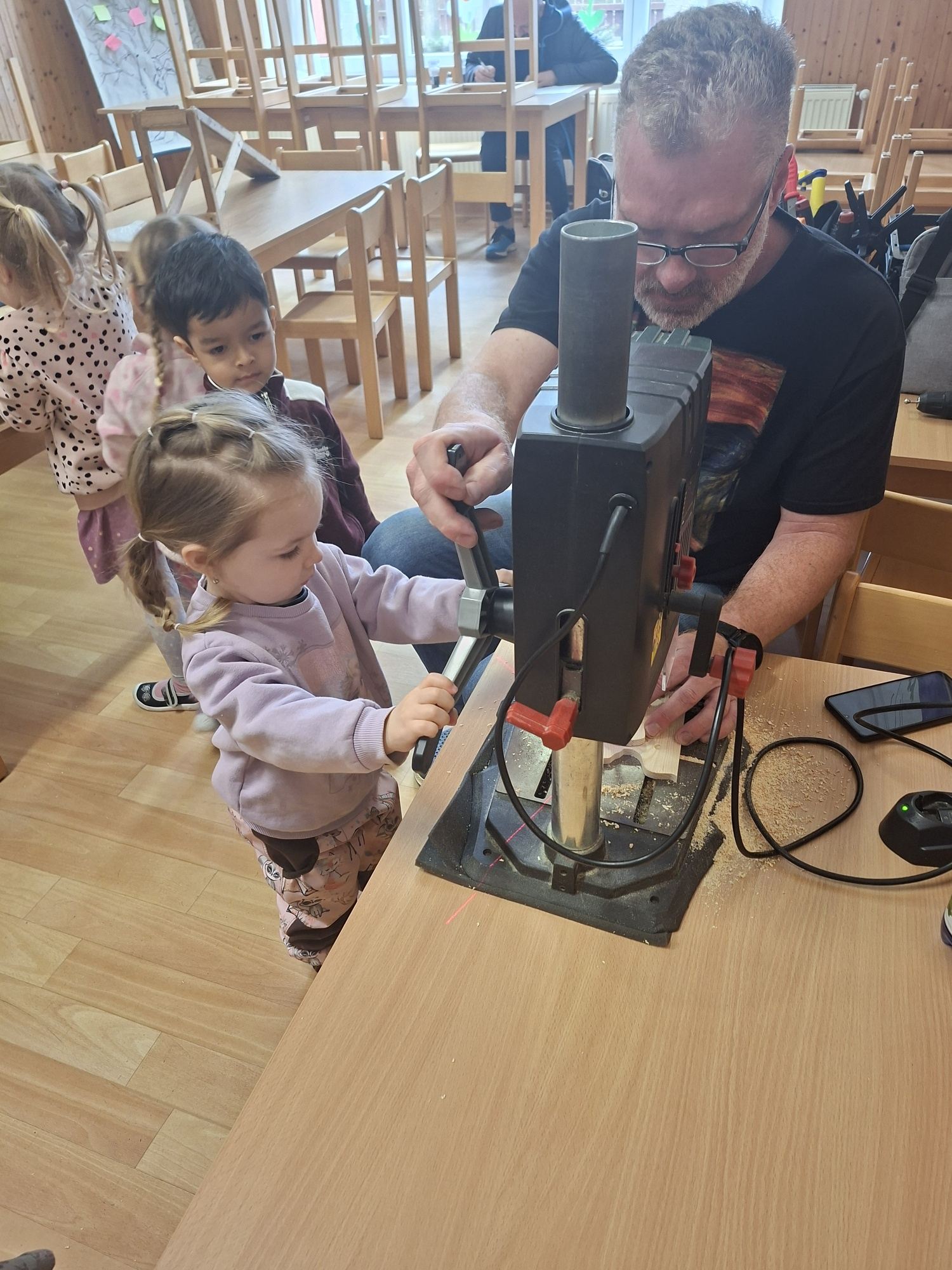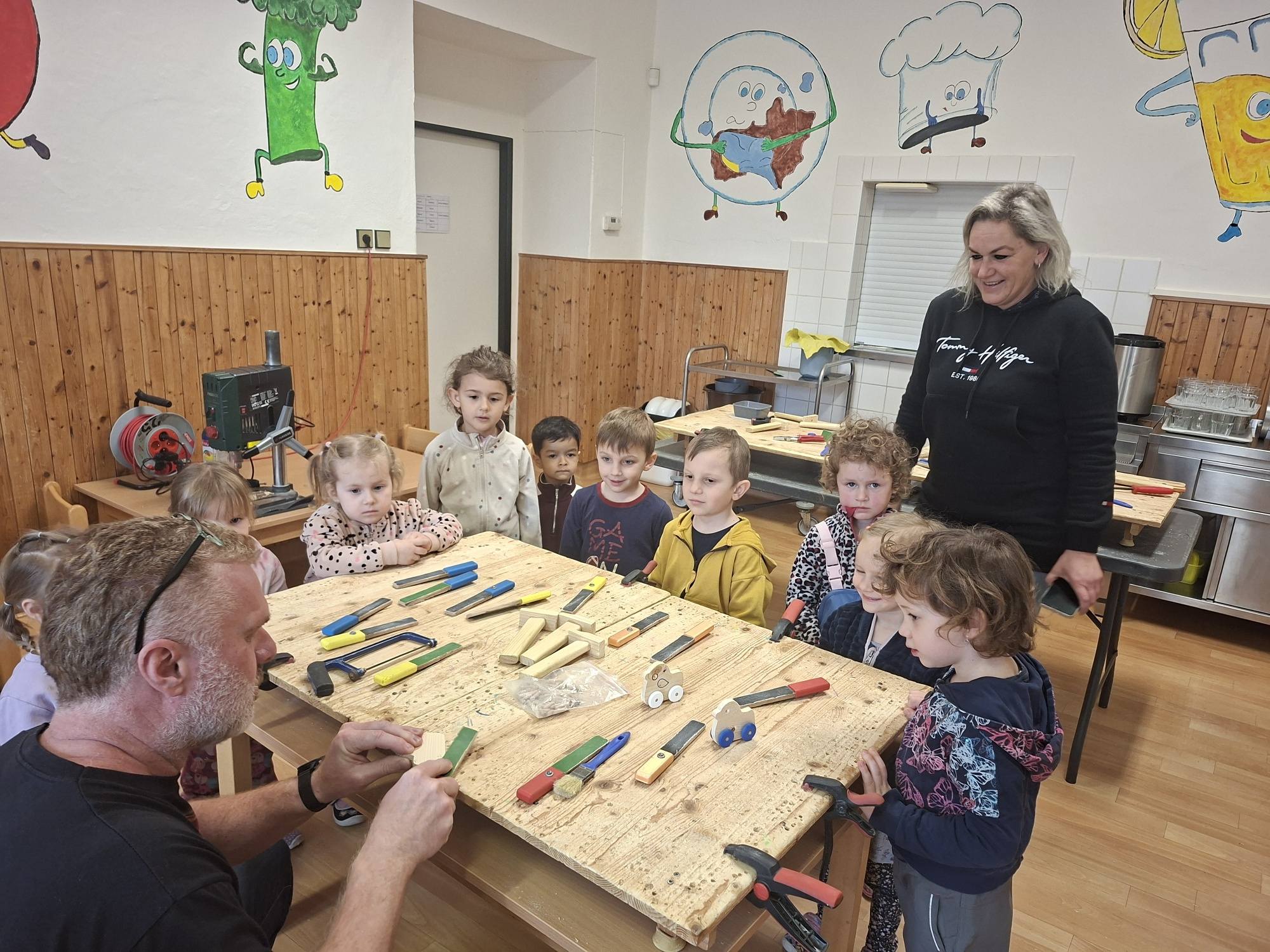 Dnes jsme měli na programu dílnu, kde jsme si mohli vyzkoušet práci se dřevem. Pod vedením zkušeného lektora se na stolech začaly objevovat dřevěné kačenky a pejsci. Hotové výrobky udělaly maminkám a tatínkům velikou radost.