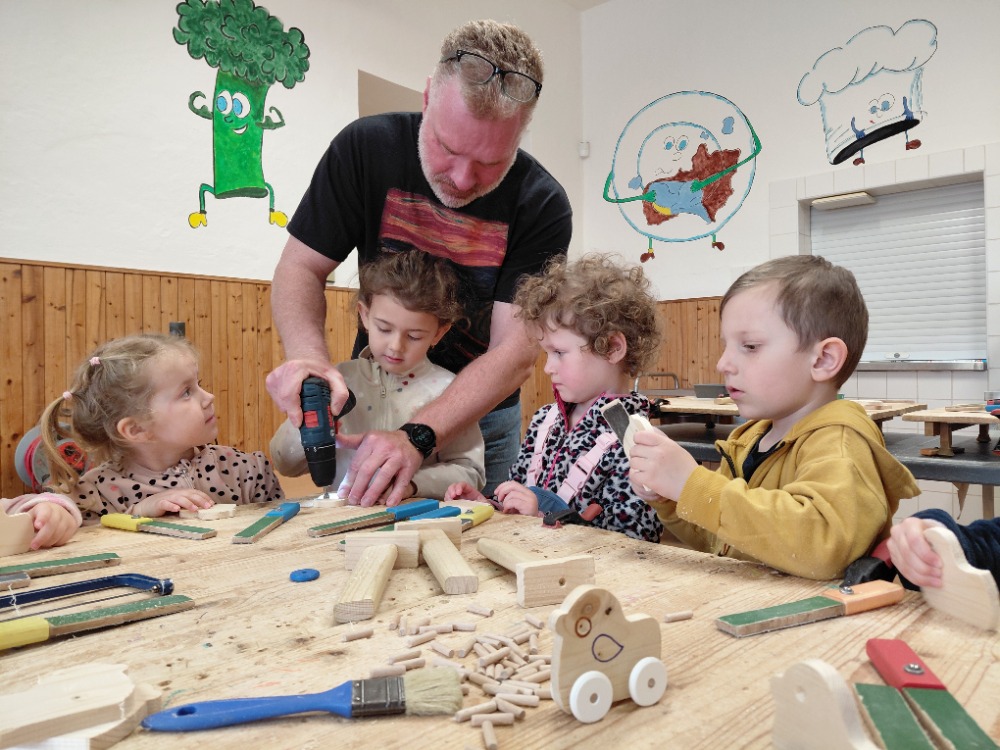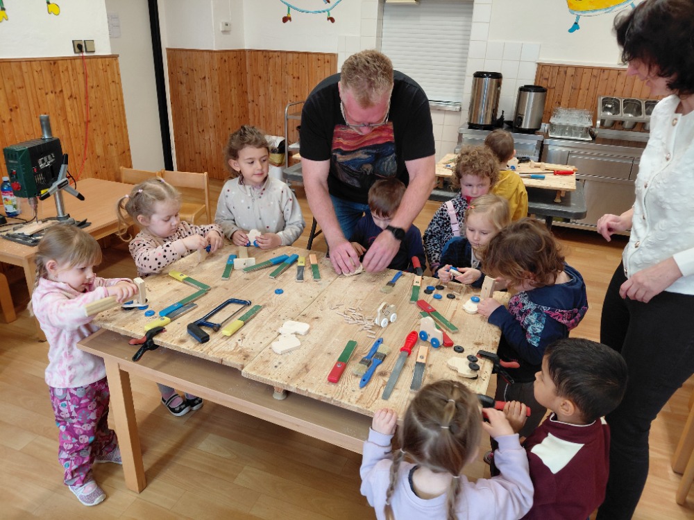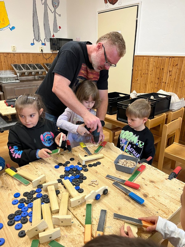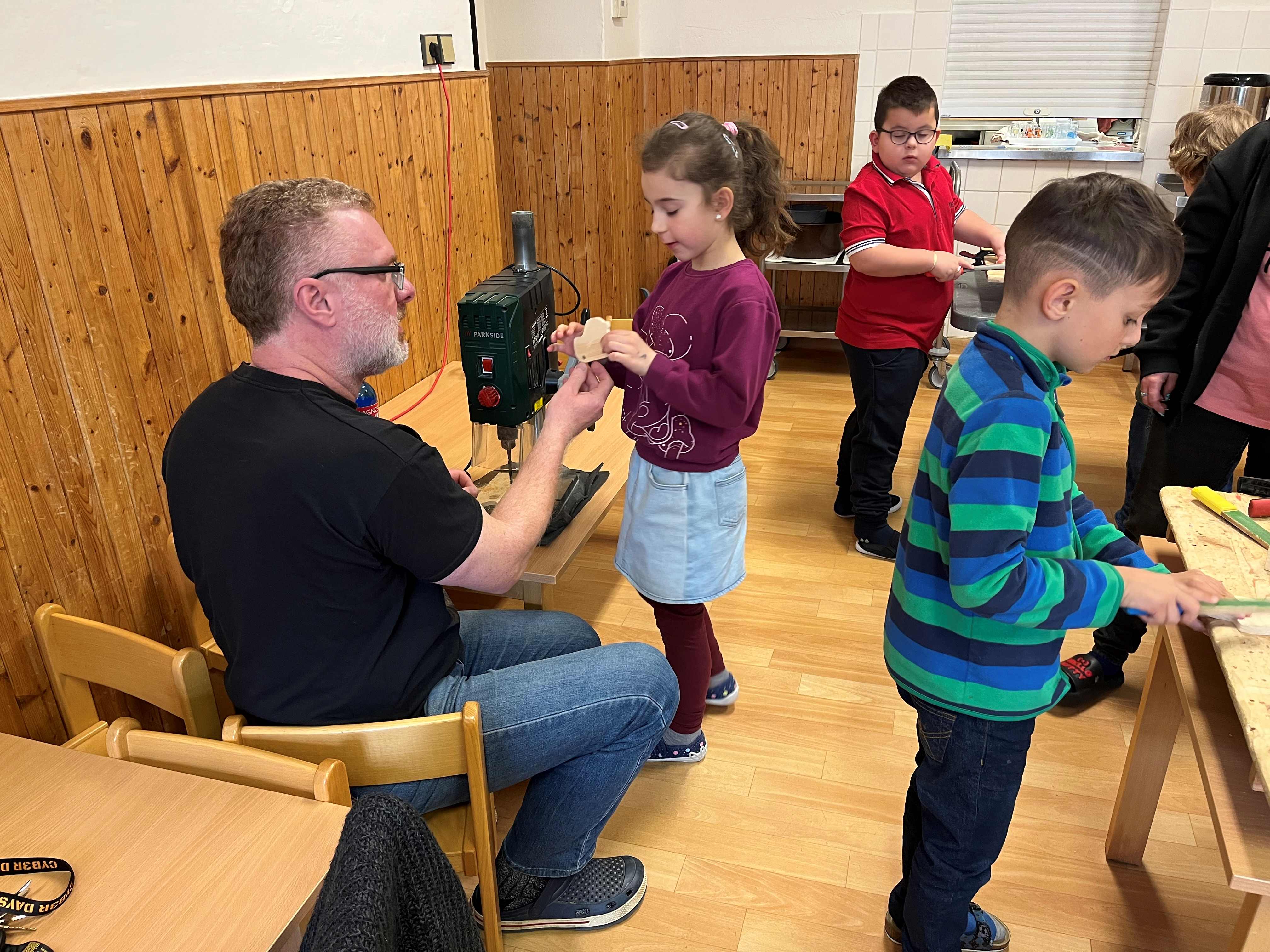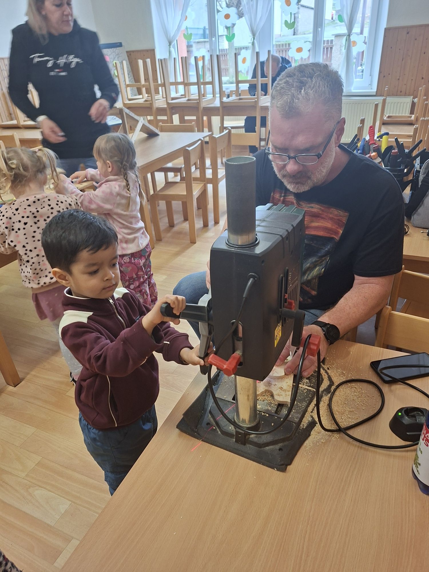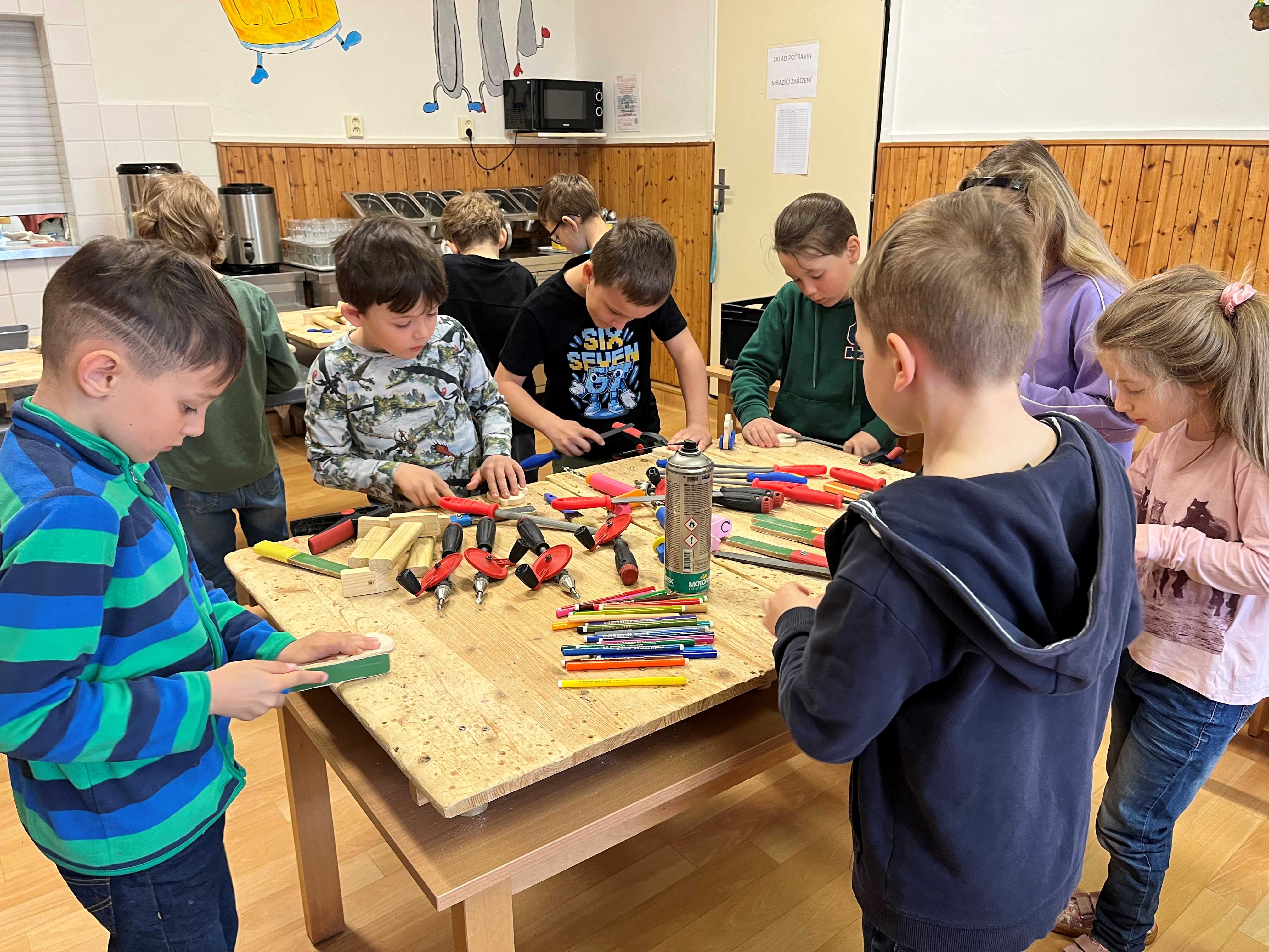 Dnes jsme měli na programu dílnu, kde jsme si mohli vyzkoušet práci se dřevem. Pod vedením zkušeného lektora se na stolech začaly objevovat dřevěné kačenky a pejsci. Hotové výrobky udělaly maminkám a tatínkům velikou radost.