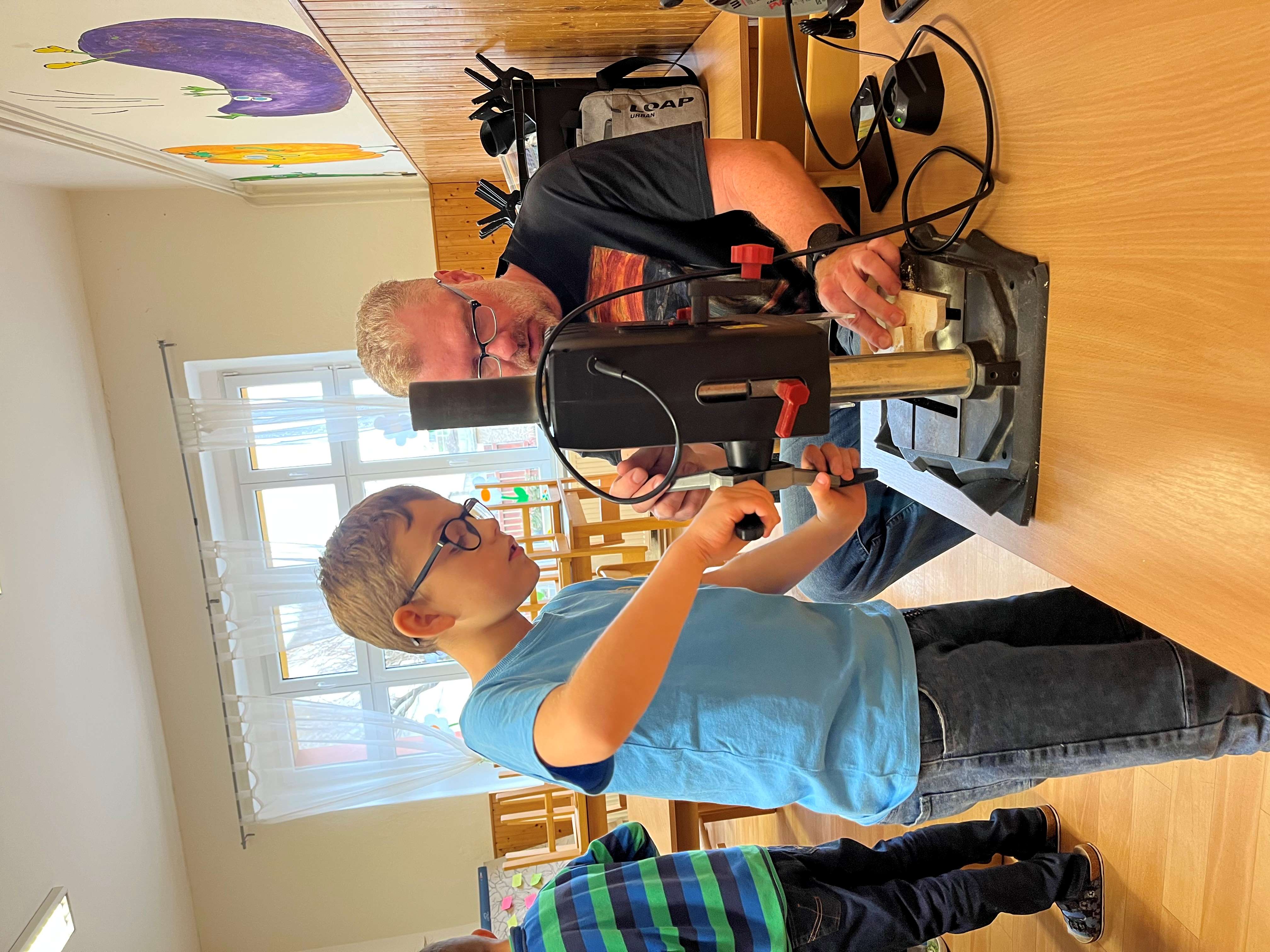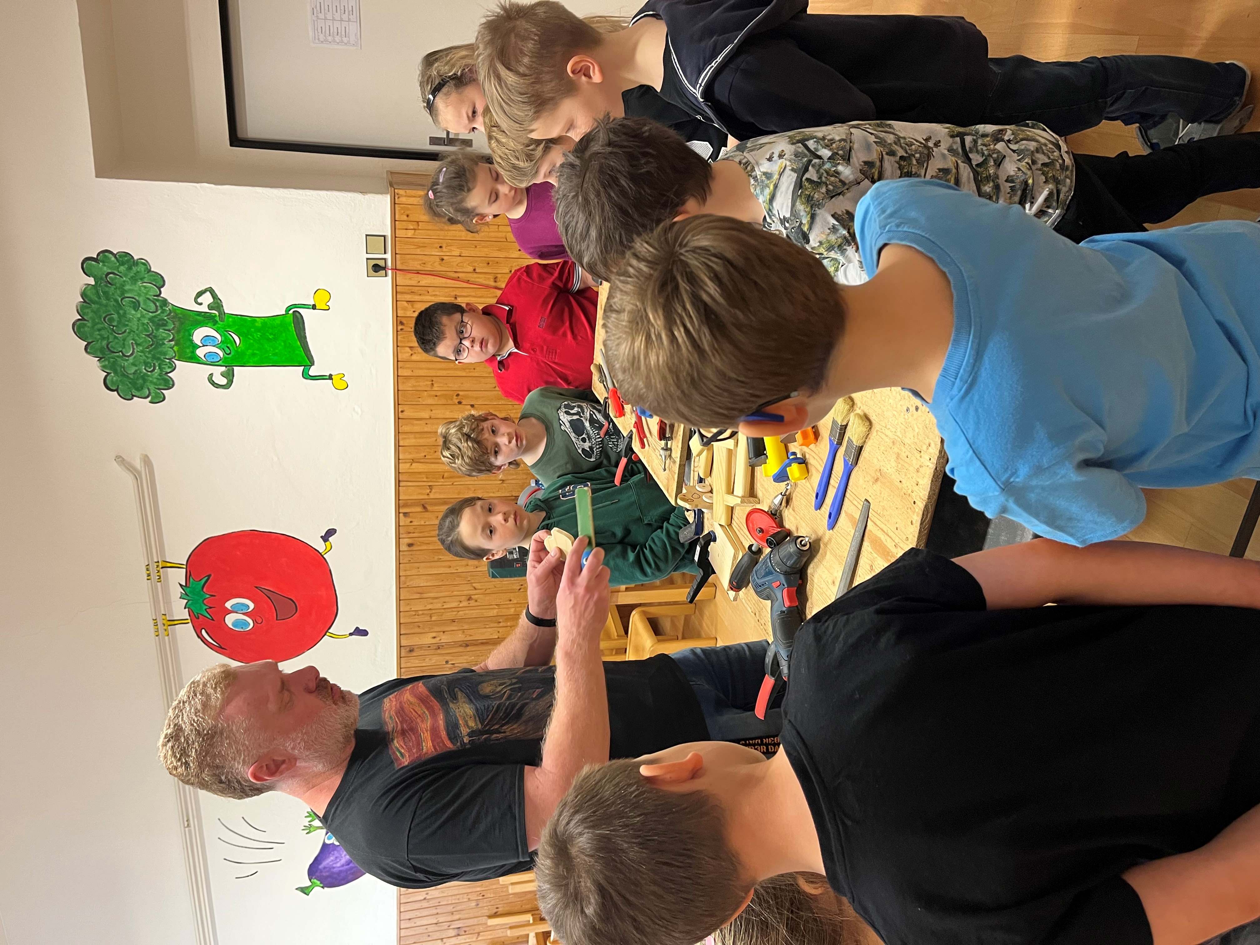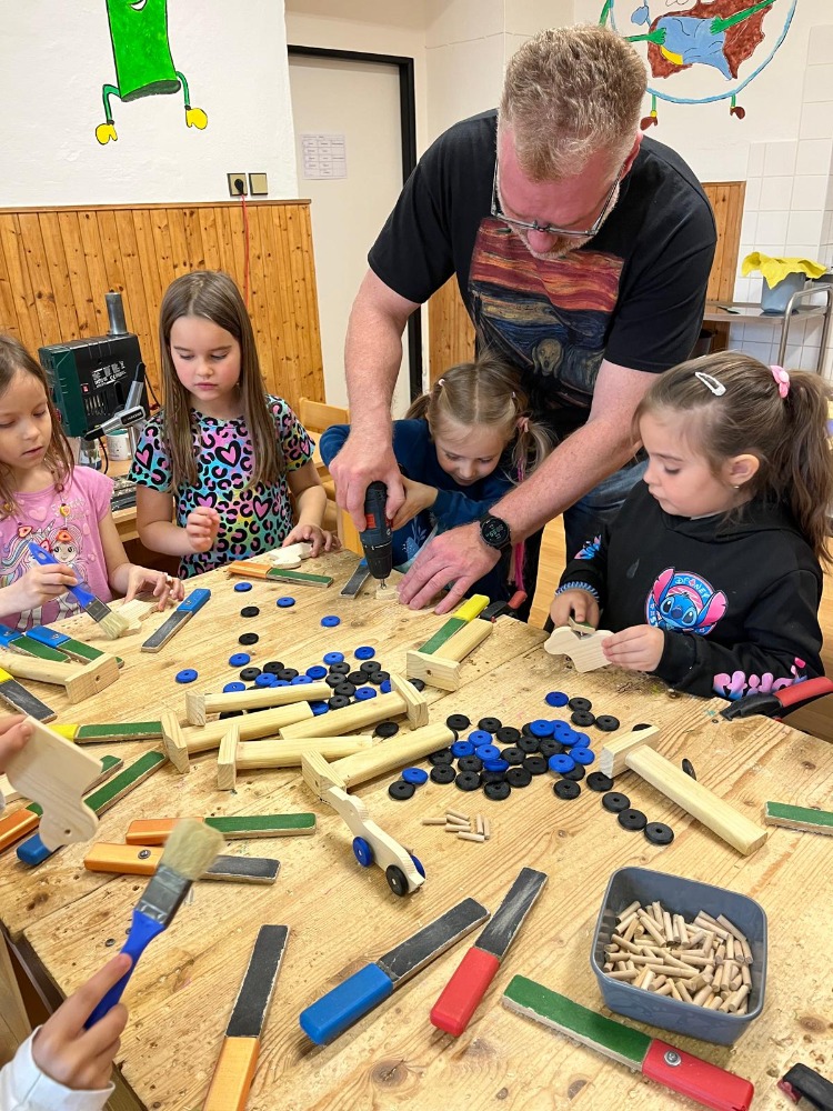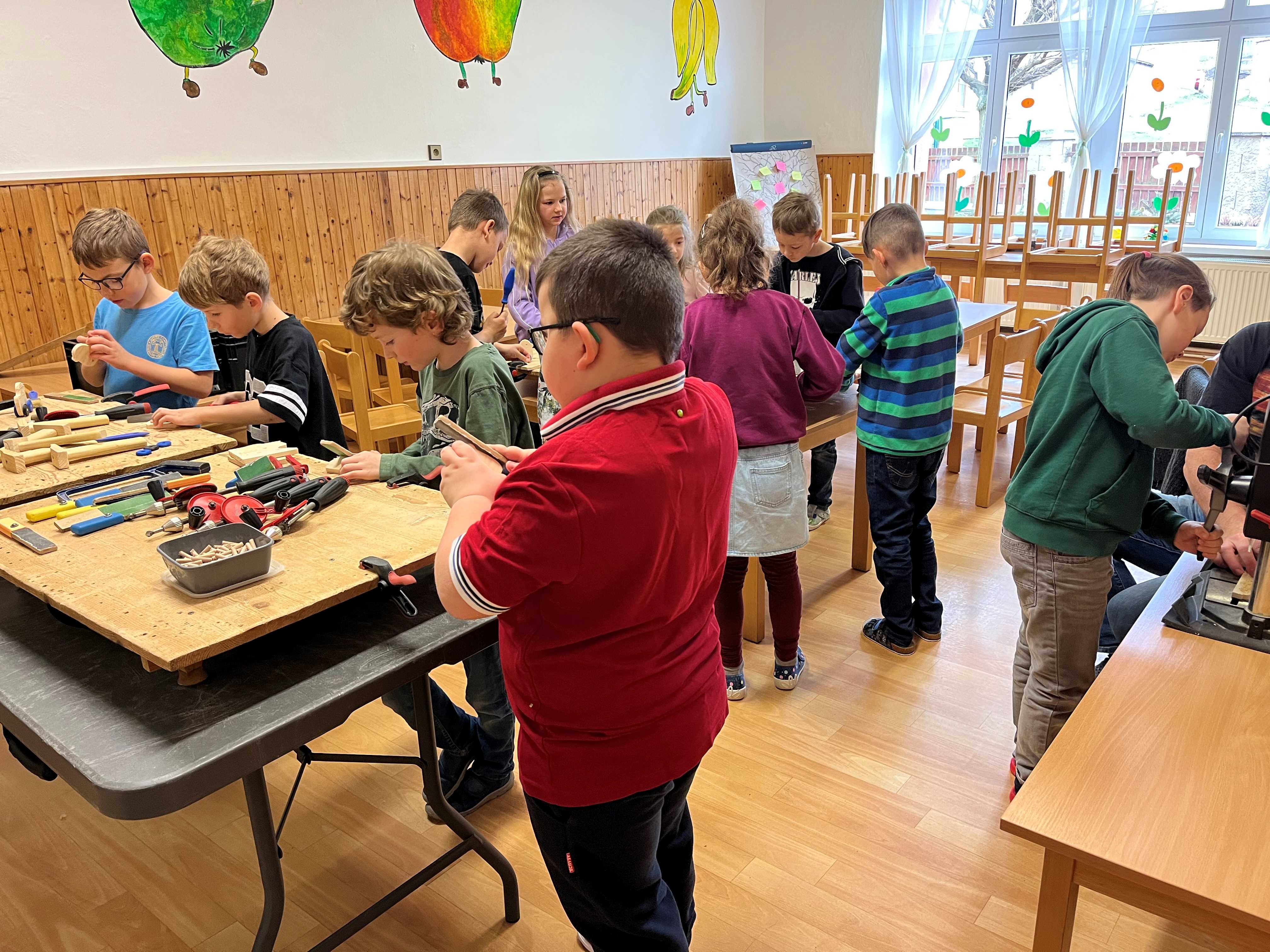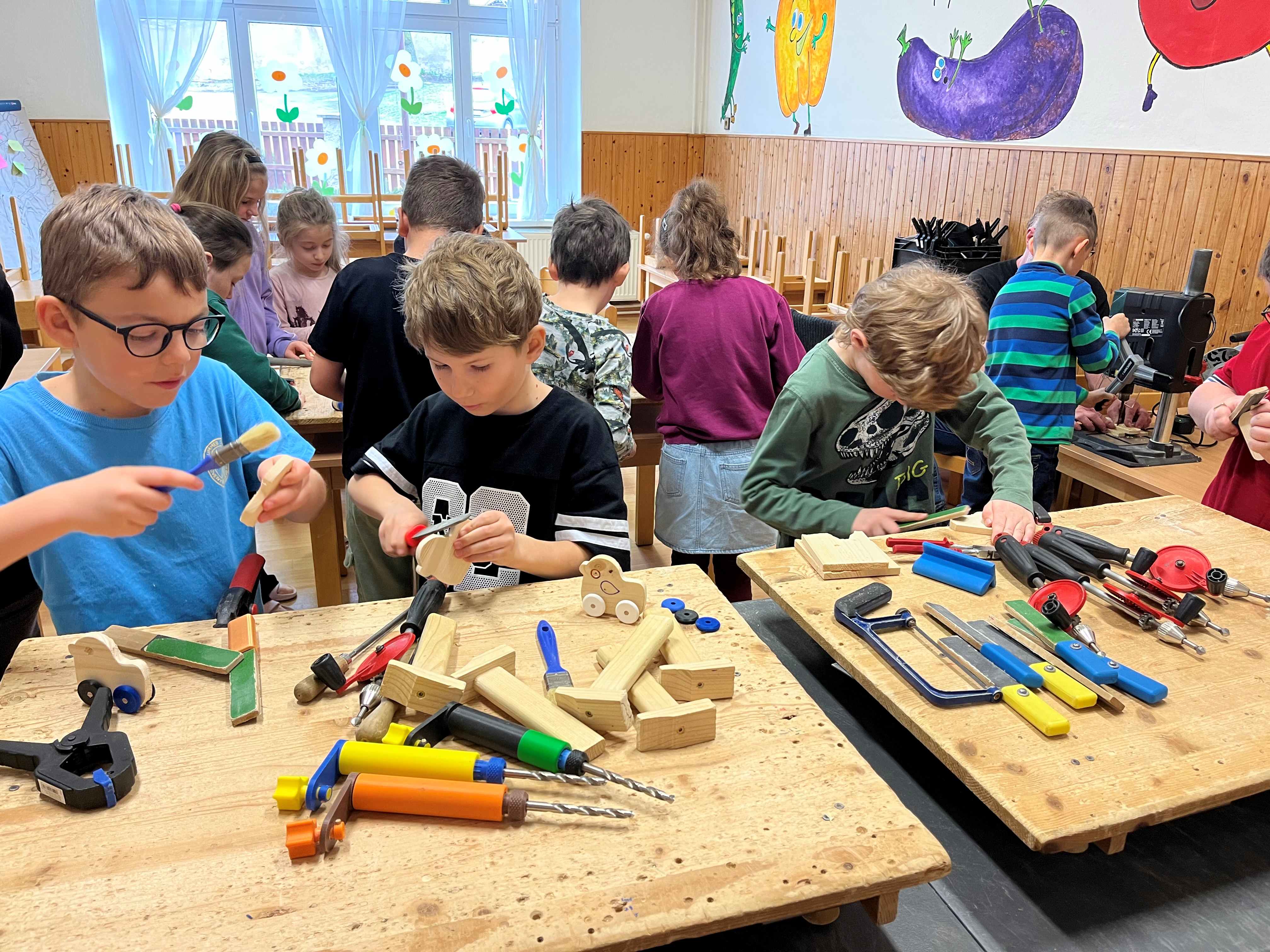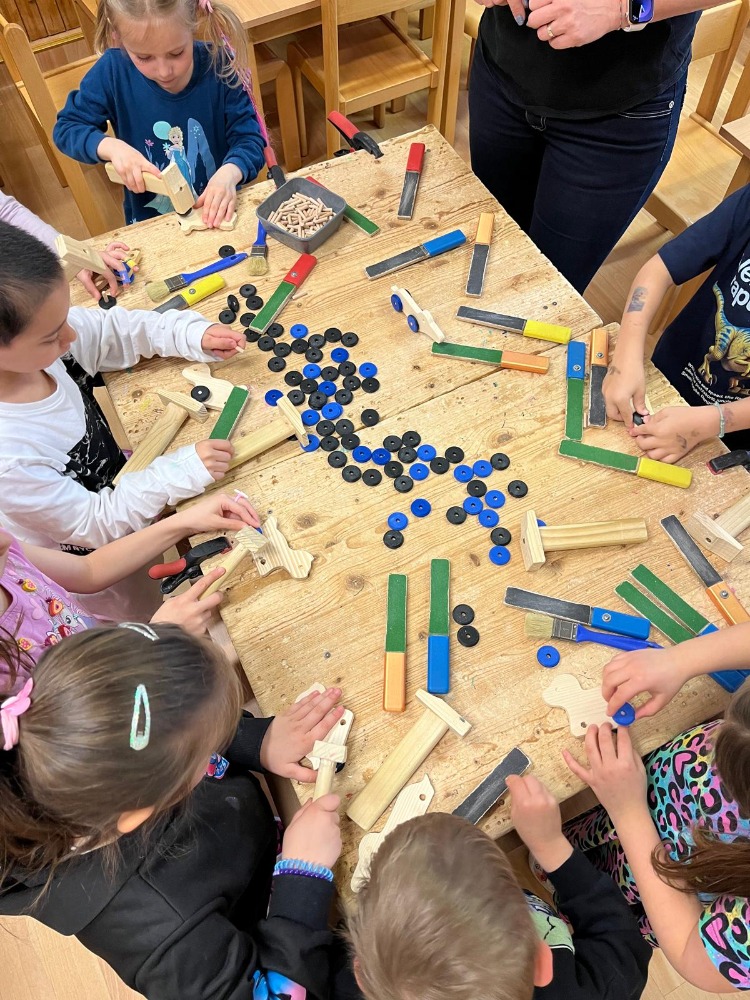 Dnes jsme měli na programu dílnu, kde jsme si mohli vyzkoušet práci se dřevem. Pod vedením zkušeného lektora se na stolech začaly objevovat dřevěné kačenky a pejsci. Hotové výrobky udělaly maminkám a tatínkům velikou radost.