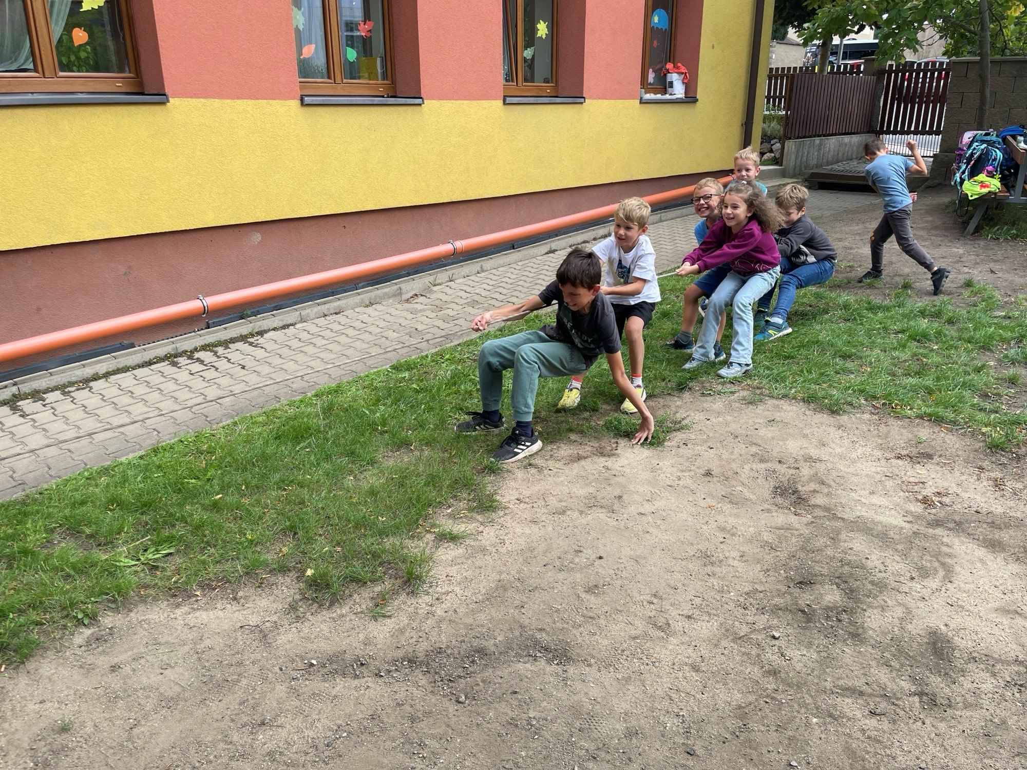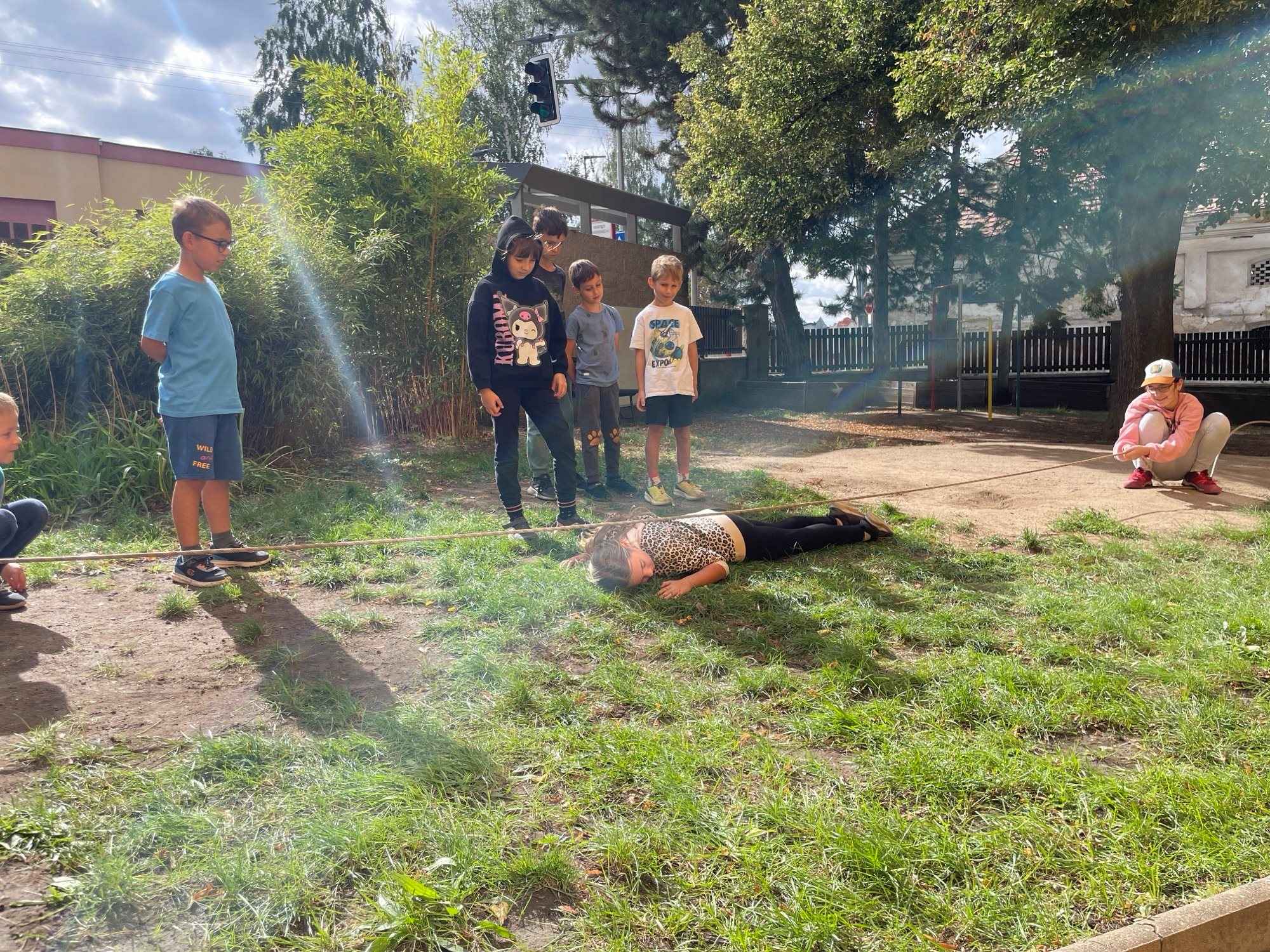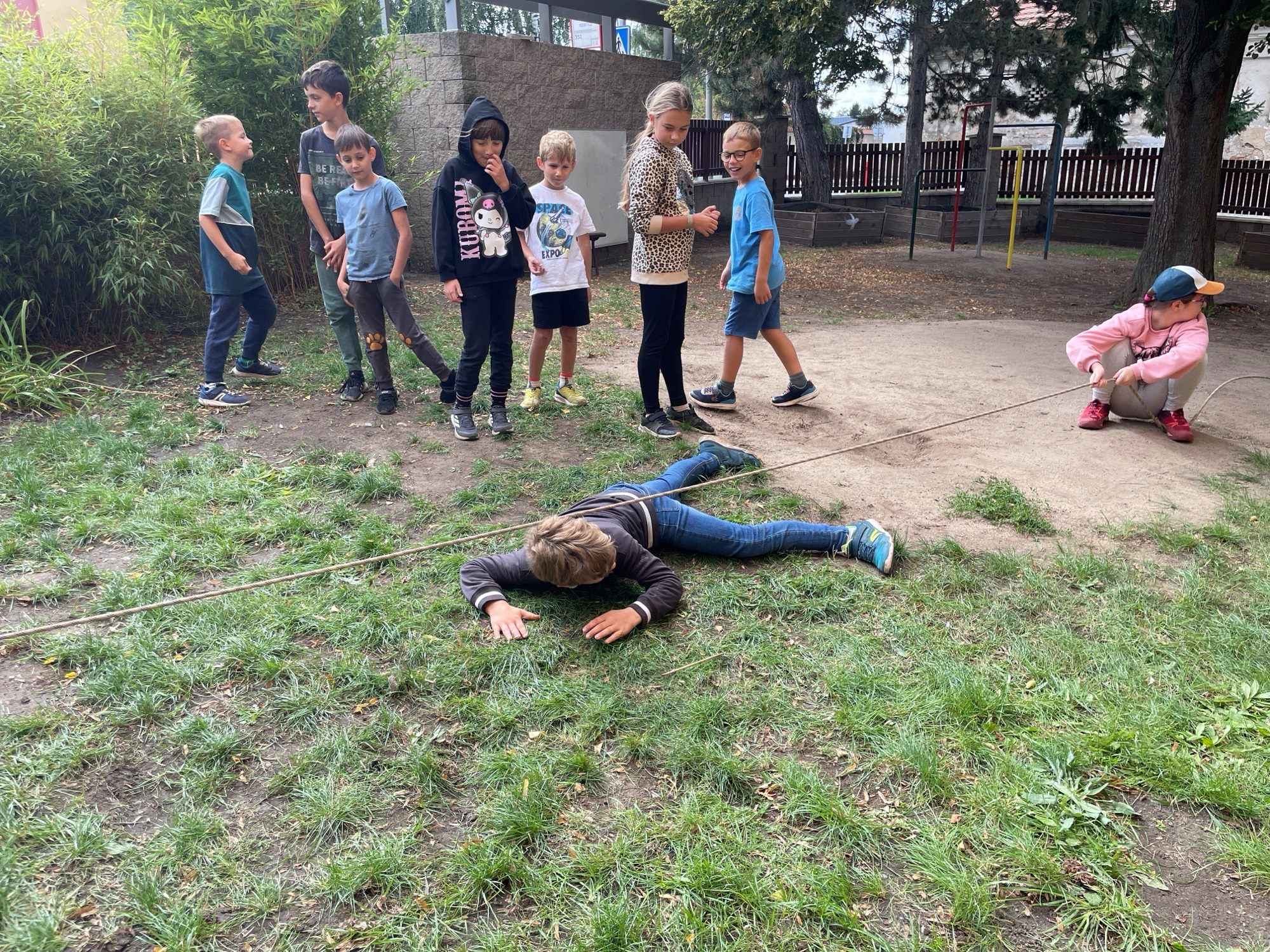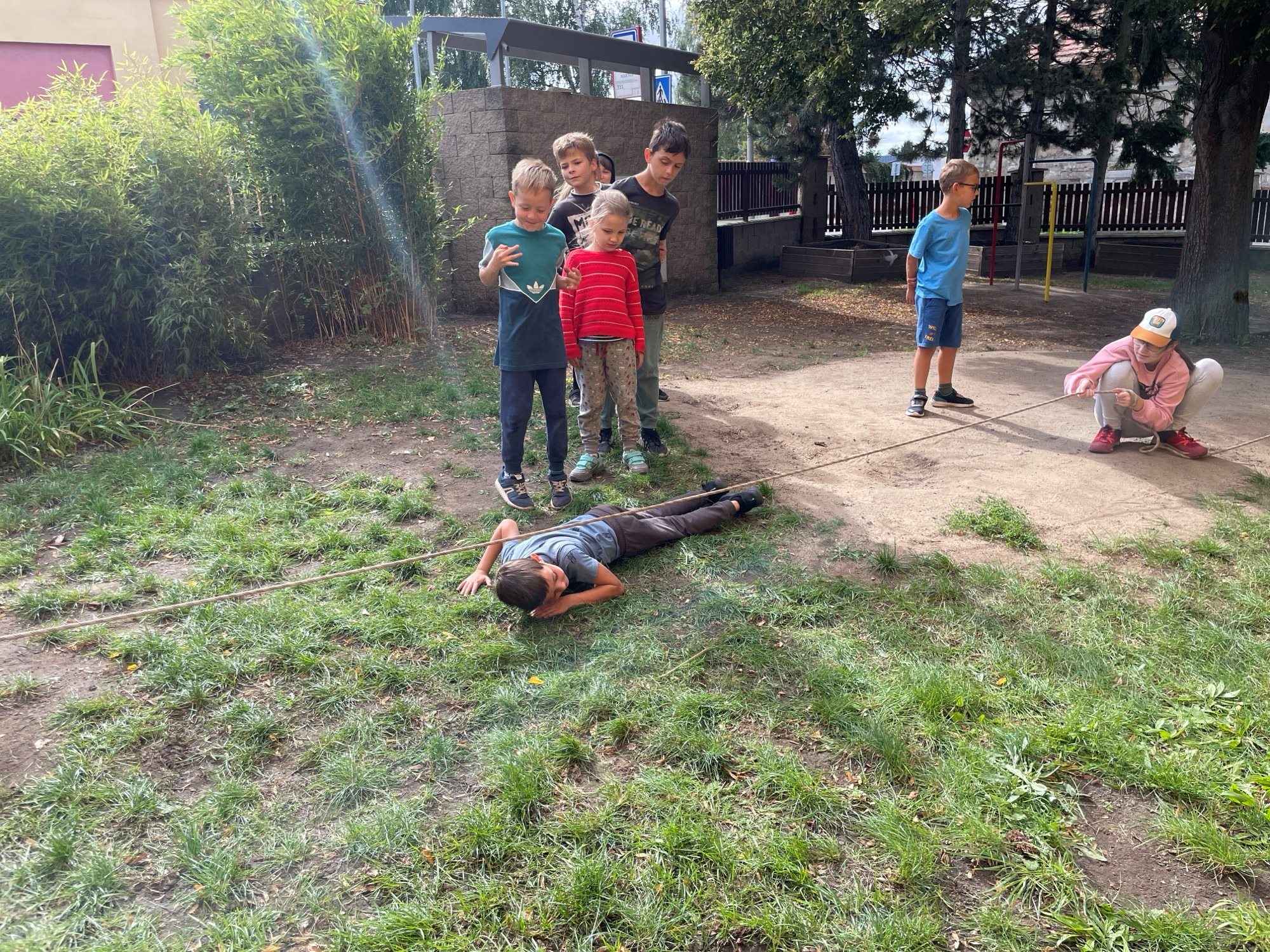 V září jsme si užívali hezké počasí hlavně venku. Hráli jsme různé hry s lanem i míčem, běhali po hřišti a sbírali přírodniny, ze kterých jsme pak tvořili podzimní výzdobu do oken i na naši nástěnku. Když jsme zrovna nebyli venku, scházeli jsme se v jurtě, kde jsme si zahráli deskovky a užili spoustu legrace
